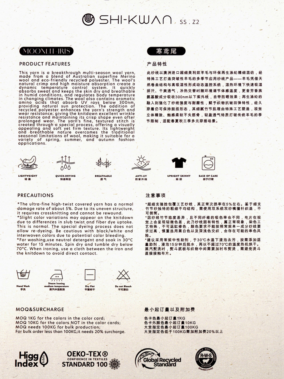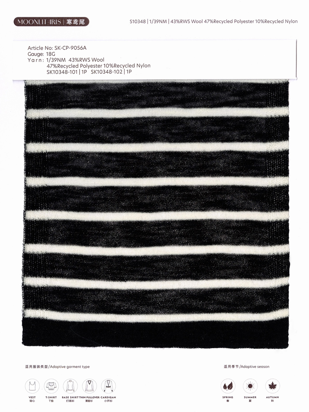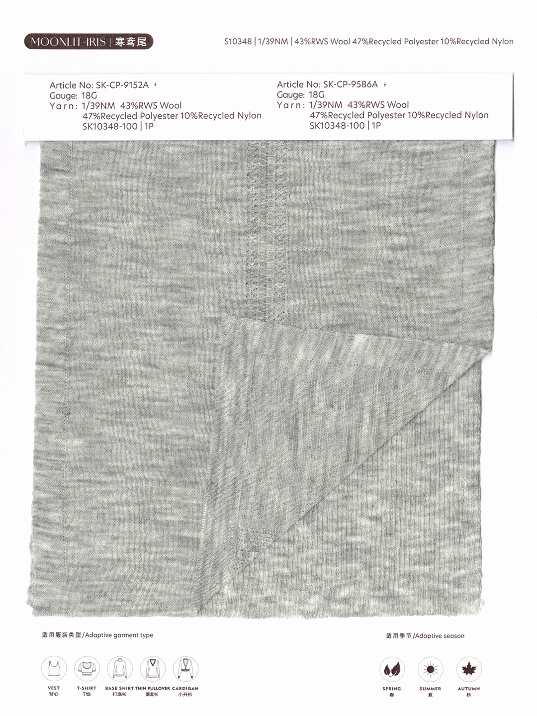 此纱线以澳洲进口超细美利奴羊毛与环保再生涤纶精细混纺,经特殊工艺打造突破性羊毛的多季节应用纱线产品——羊毛凭借天然卷曲结构与高吸湿性形成动态温控系统,湿热环境下快速吸湿排汗、干爽透气,冷热交替时随环境调节体感温度,更含芳香族氨基酸成分吸收 300nm 以下紫外线,自带防晒效果;再生涤纶的融入则强化了纱线强度与耐磨性,赋予织物抗皱回弹特性,经久穿着仍可保持挺括形态,其细腻竹节肌理由特殊工艺塑造,视觉立体精致、触感柔软不失筋骨,轻盈透气特质打破传统羊毛的季节限制,适配春夏秋三季多元穿搭场景。