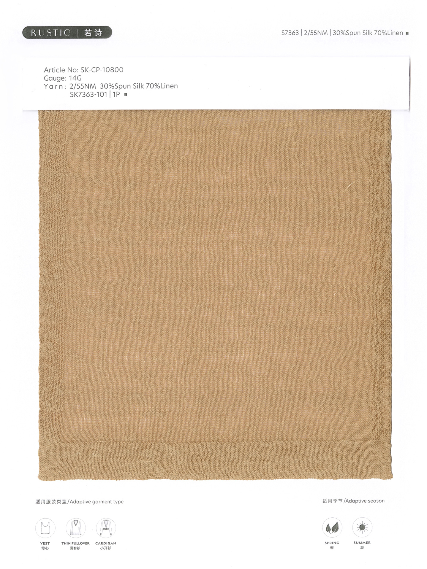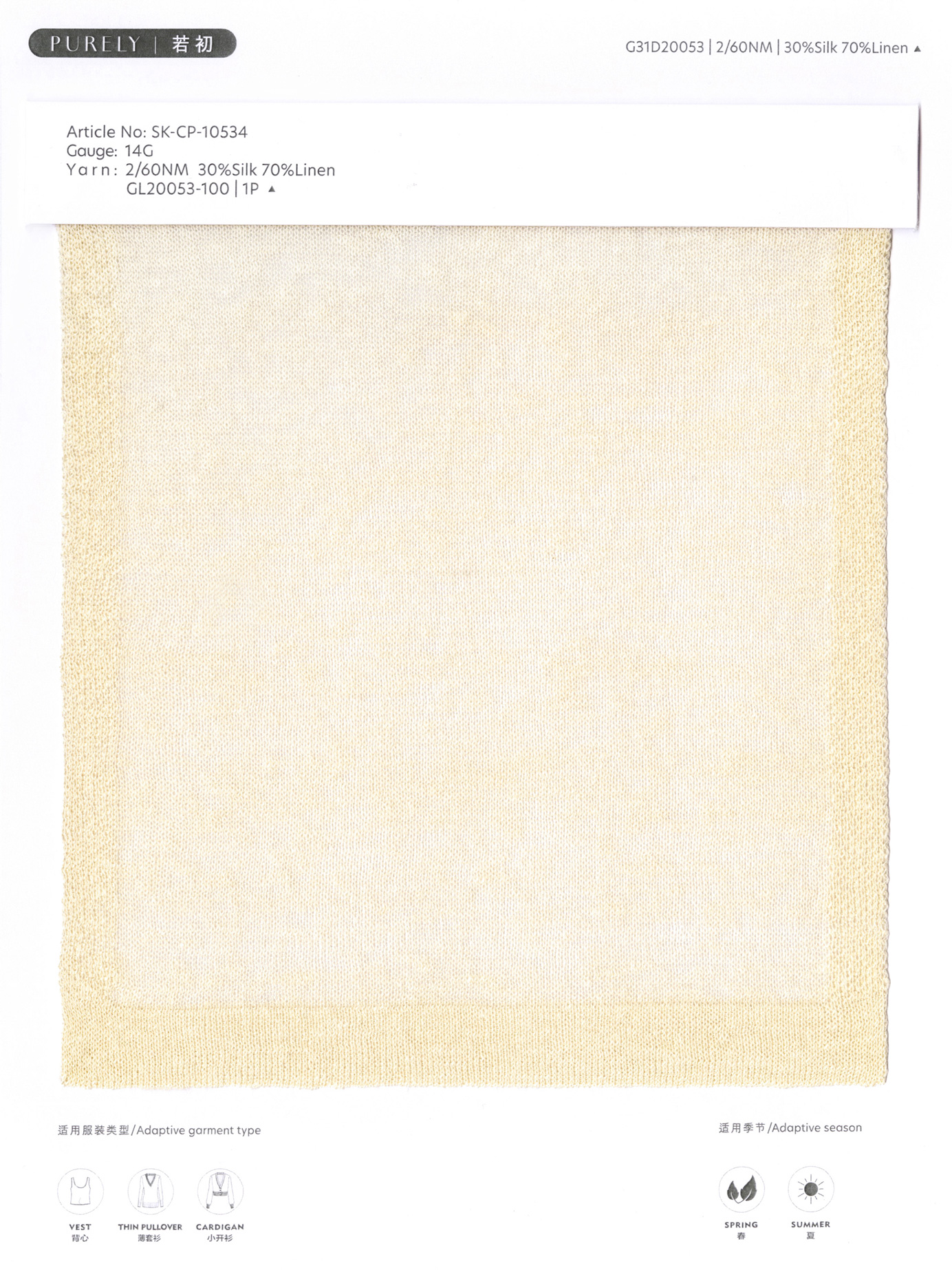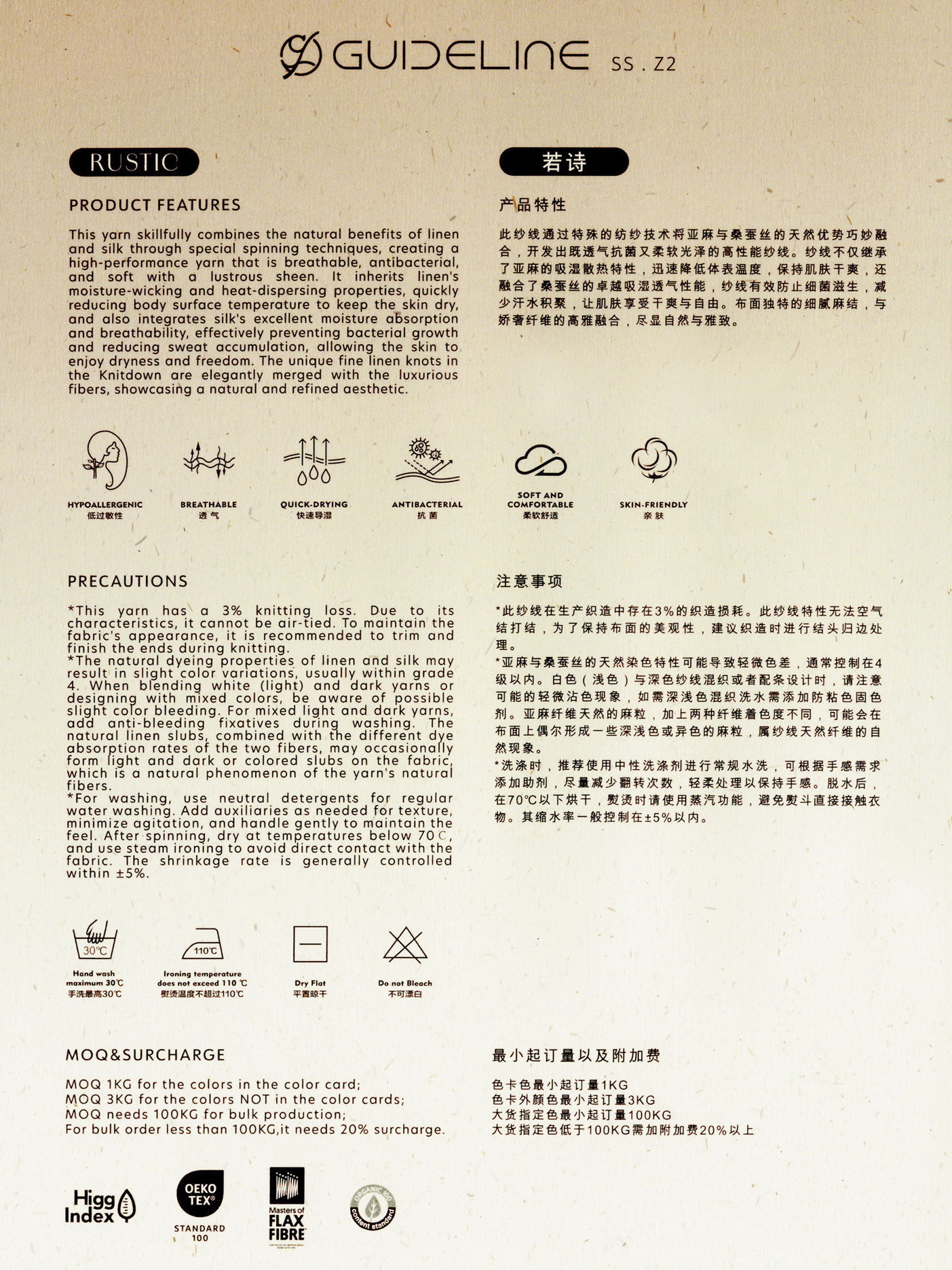 此纱线通过特殊的纺纱技术将亚麻与桑蚕丝的天然优势巧妙融合,开发出既透气抗菌又柔软光泽的高性能纱线。纱线不仅继承了亚麻的吸湿散热特性,迅速降低体表温度,保持肌肤干爽,还融合了桑蚕丝的卓越吸湿透气性能,纱线有效防止细菌滋生,减少汗水积聚,让肌肤享受干爽与自由。布面独特的细腻麻结,与娇奢纤维的高雅融合,尽显自然与雅致。
