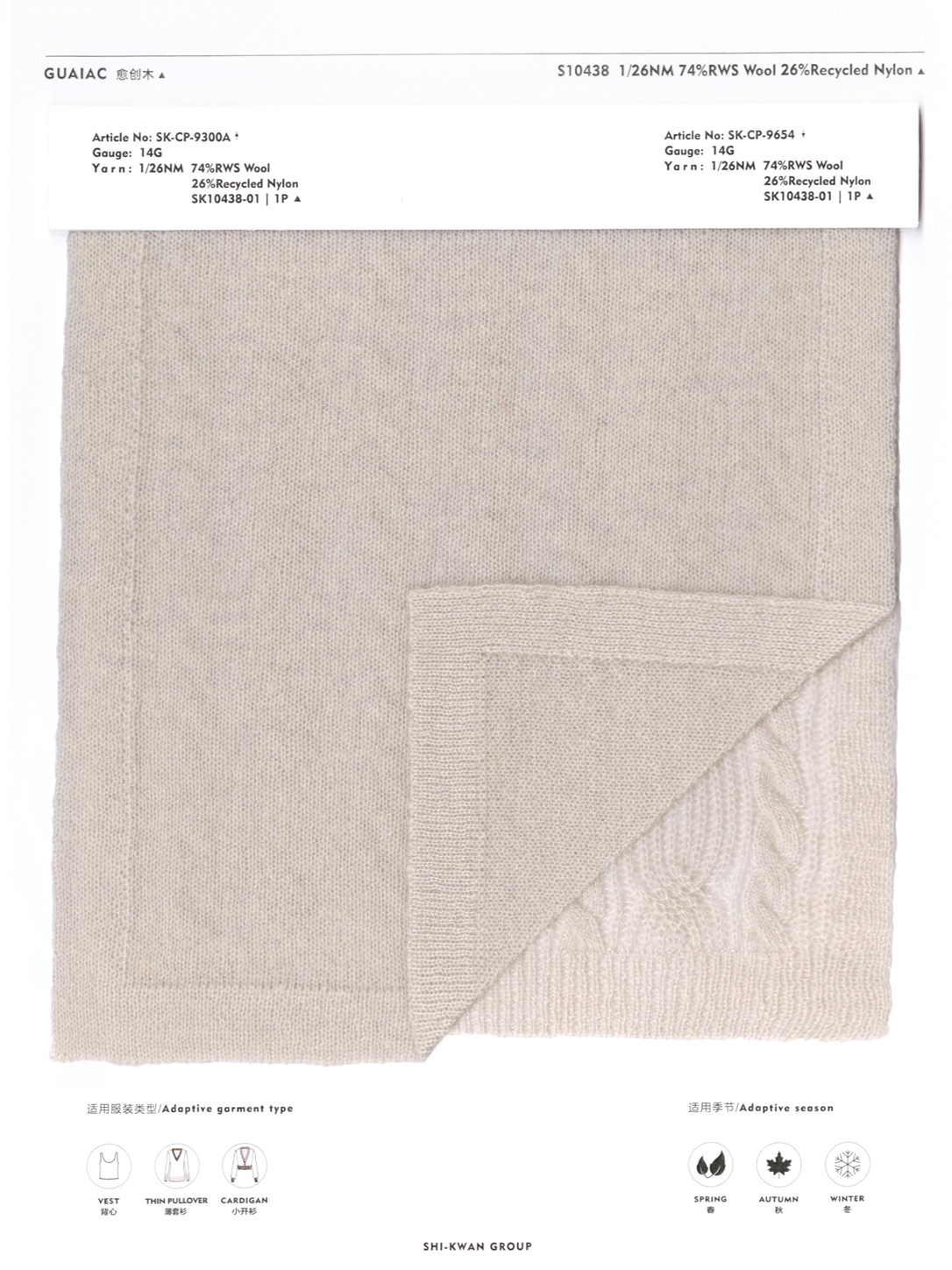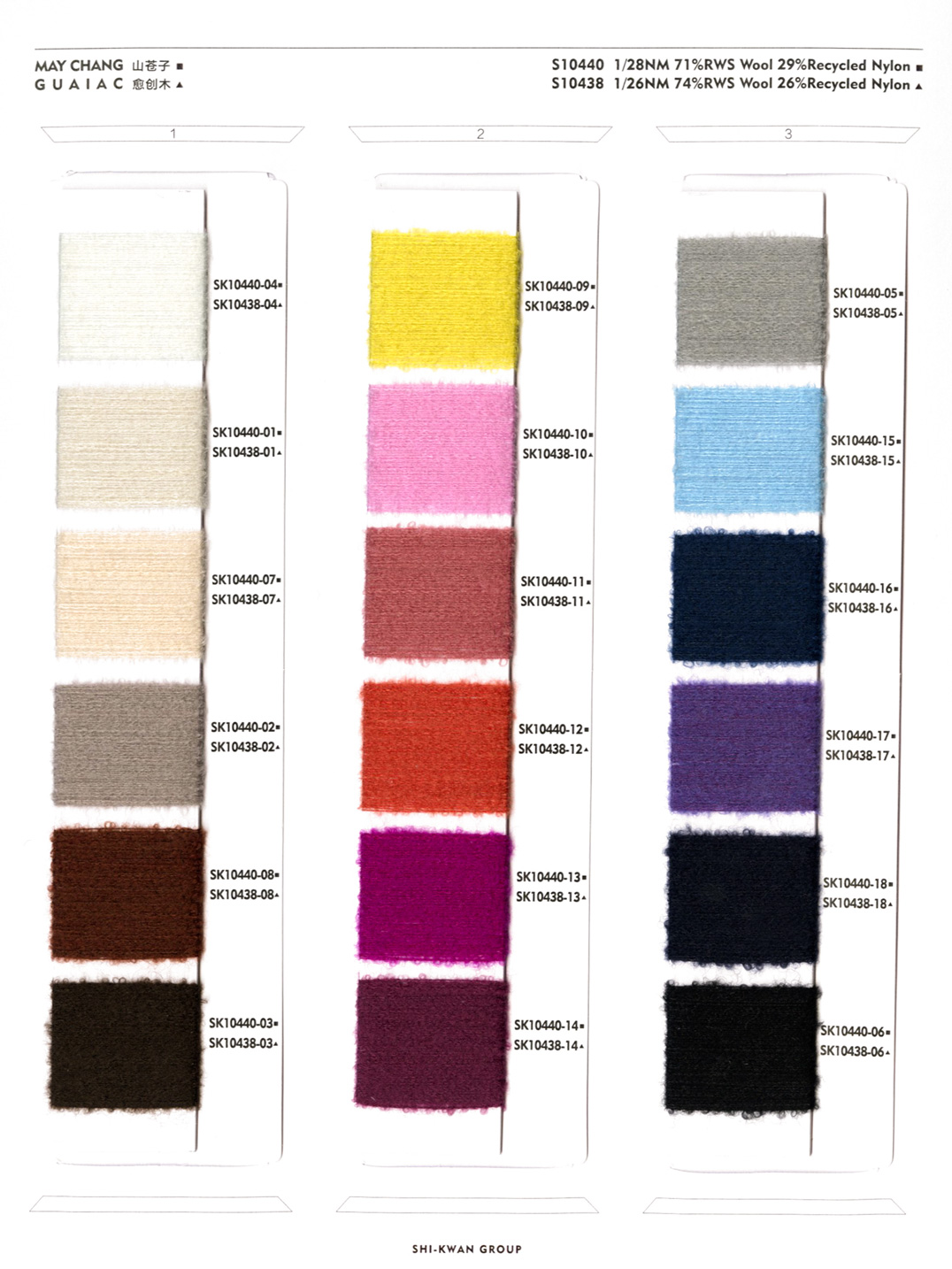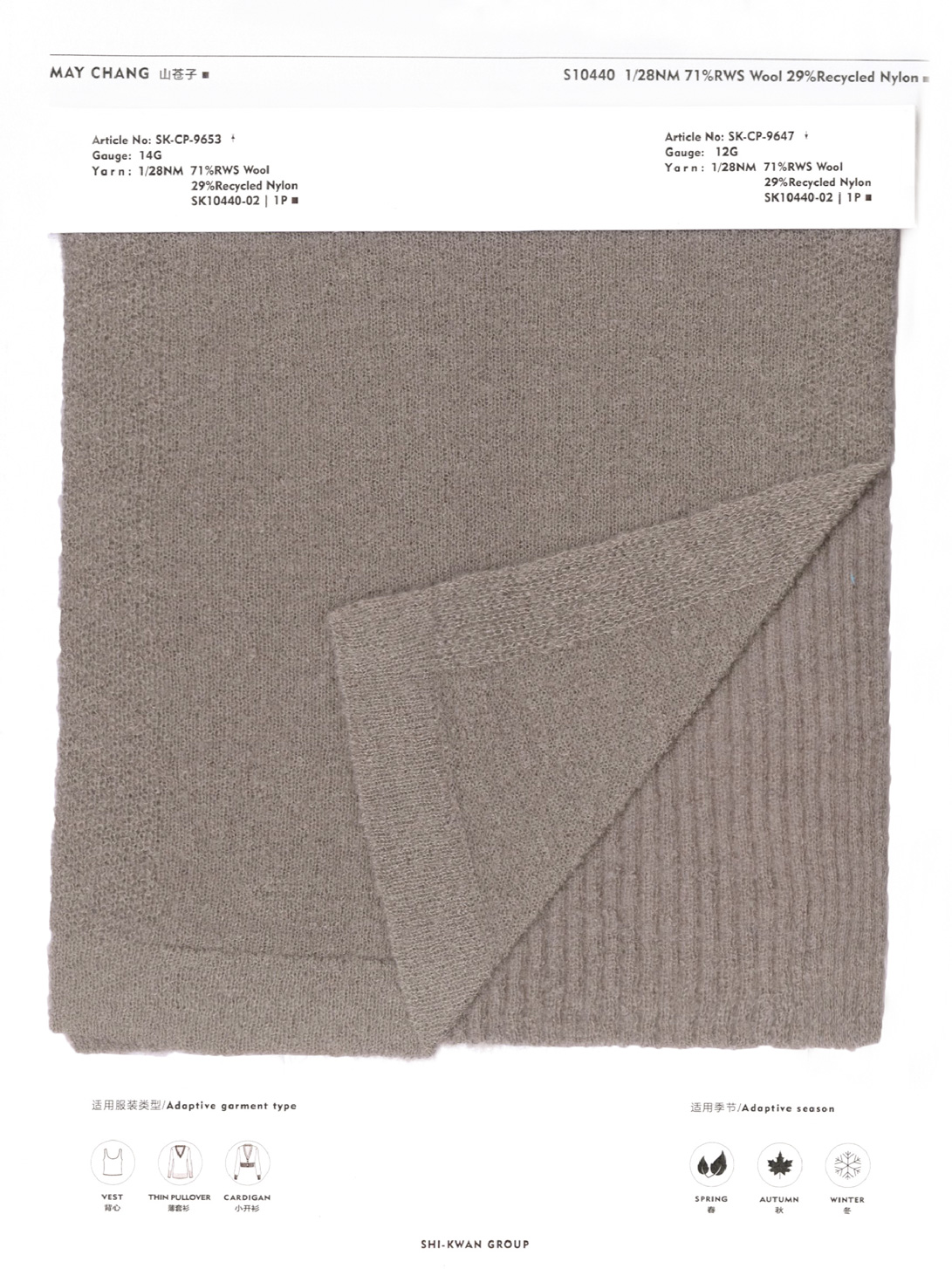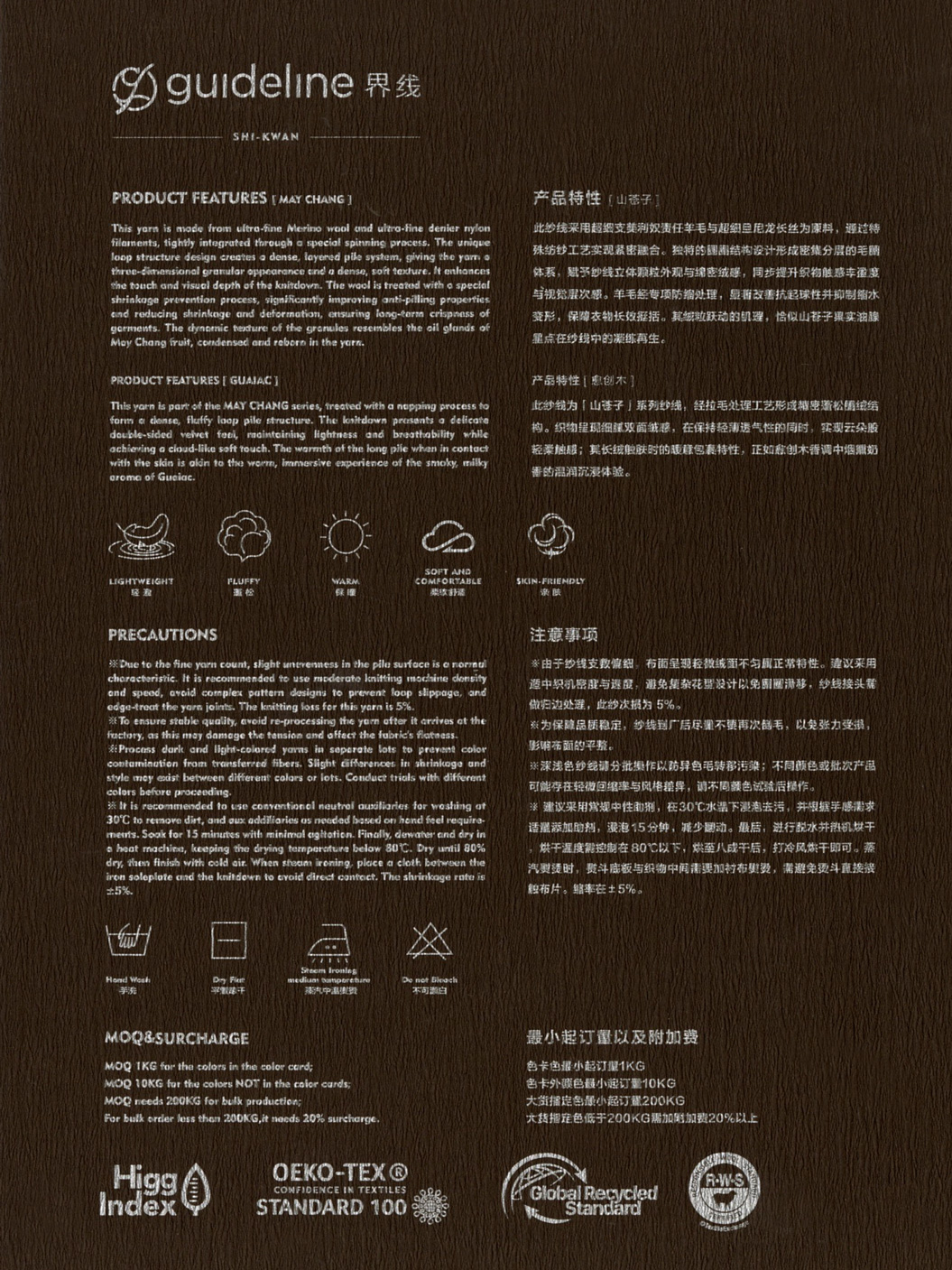 「山苍子」 此纱线采用超细支美利奴责任羊毛与超细旦尼龙长丝为原料,通过特殊纺纱工艺实现紧密融合。独特的圈圈结构设计形成密集分层的毛圈体系,赋予纱线立体颗粒外观与绵密绒感,同步提升织物触感丰盈度与视觉层次感。羊毛经专项防缩处理,显著改善抗起球性并抑制缩水变形,保障衣物长效挺括。其绒粒跃动的肌理,恰似山苍子果实油腺星点在纱线中的凝练再生。