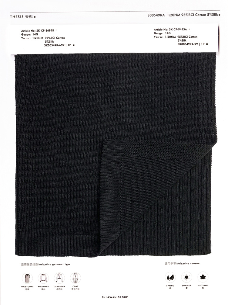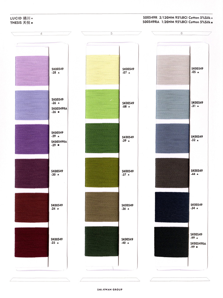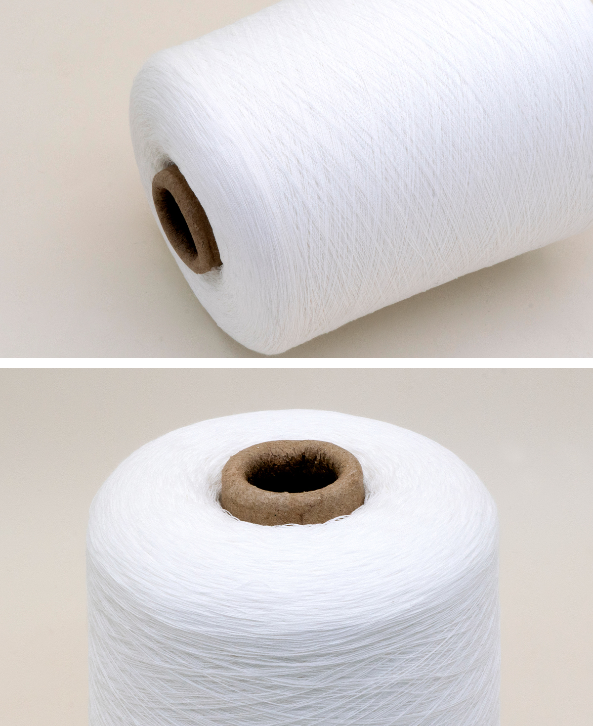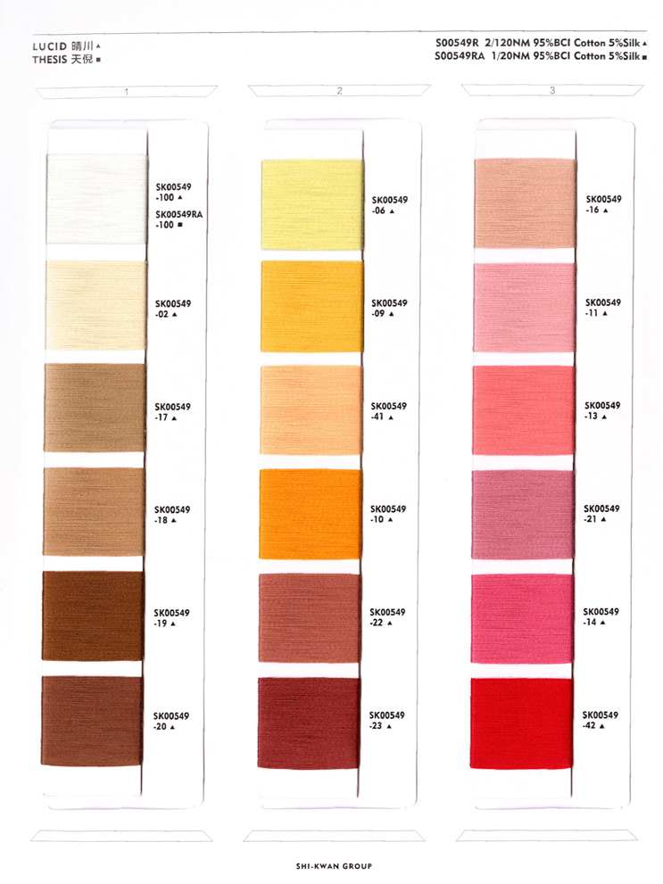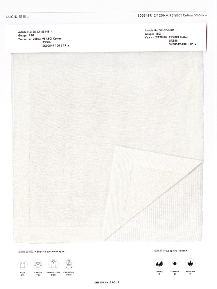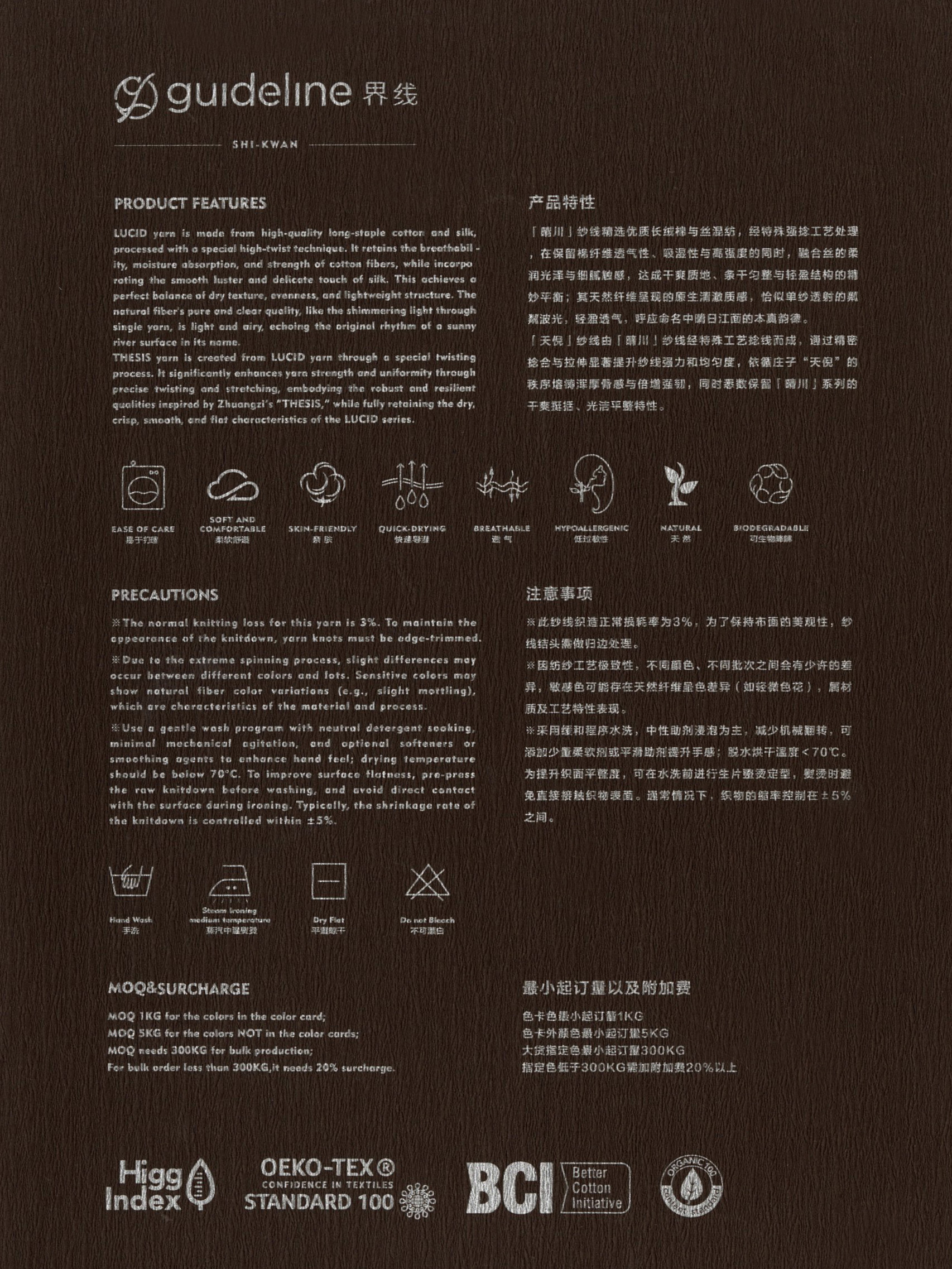 「晴川」纱线精选优质长绒棉与丝混纺,经特殊强捻工艺处理,在保留棉纤维透气性、吸湿性与高强 度的同时,融合丝的柔润光泽与细腻触感,达成干爽质地、条干匀整与轻盈结构的精妙平衡;其天然纤维呈现的原生清澈质感,恰似单纱透射的粼粼波光,轻盈透气,呼应命名中晴日江面的本真韵律。 「天倪」纱线由「晴川」纱线经特殊工艺捻线而成,通过精密捻合与拉伸显著提升纱线强力和均匀度,依循庄子“天倪”的秩序熔铸浑厚骨感与倍增强韧,同时悉数保留「晴川」系列的干爽挺括、光洁平整特性。
