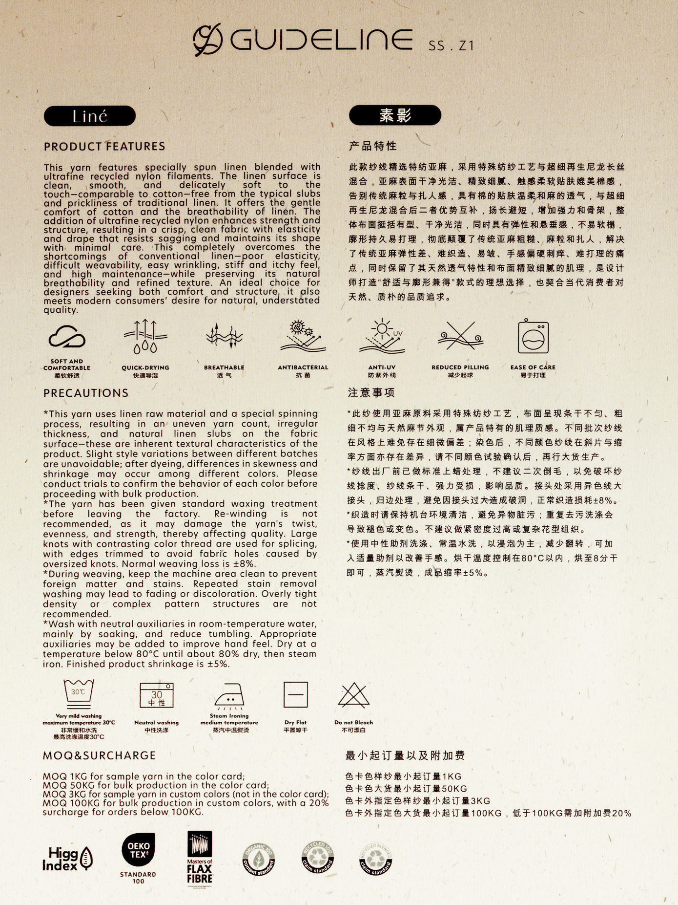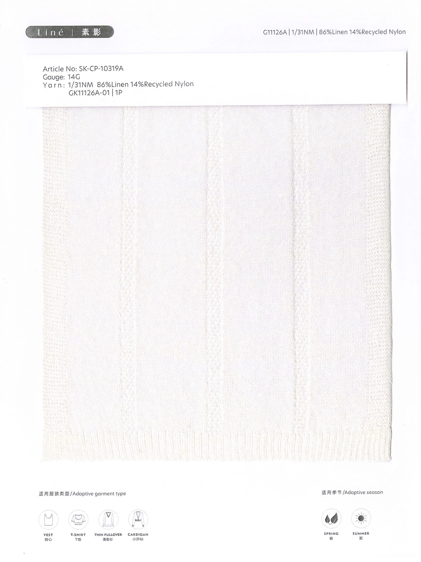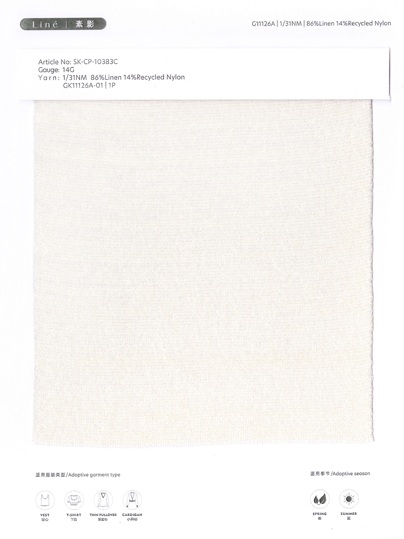 此款纱线精选特纺亚麻,采用特殊纺纱工艺与超细再生尼龙长丝混合,亚麻表面干净光洁、精致细腻、触感柔软贴肤媲美棉感,告别传统麻粒与扎人感,具有棉的贴肤温柔和麻的透气,与超细再生尼龙混合后二者优势互补,扬长避短,增加强力和骨架,整体布面挺括有型、干净光洁,同时具有弹性和悬垂感,不易软榻,廓形持久易打理,彻底颠覆了传统亚麻粗糙、麻粒和扎人,解决了传统亚麻弹性差、难织造、易皱、手感偏硬刺痒、难打理的痛点,同时保留了其天然透气特性和布面精致细腻的肌理,是设计师打造“舒适与廓形兼得”款式的理想选择,也契合当代消费者对天然、质朴的品质追求。
