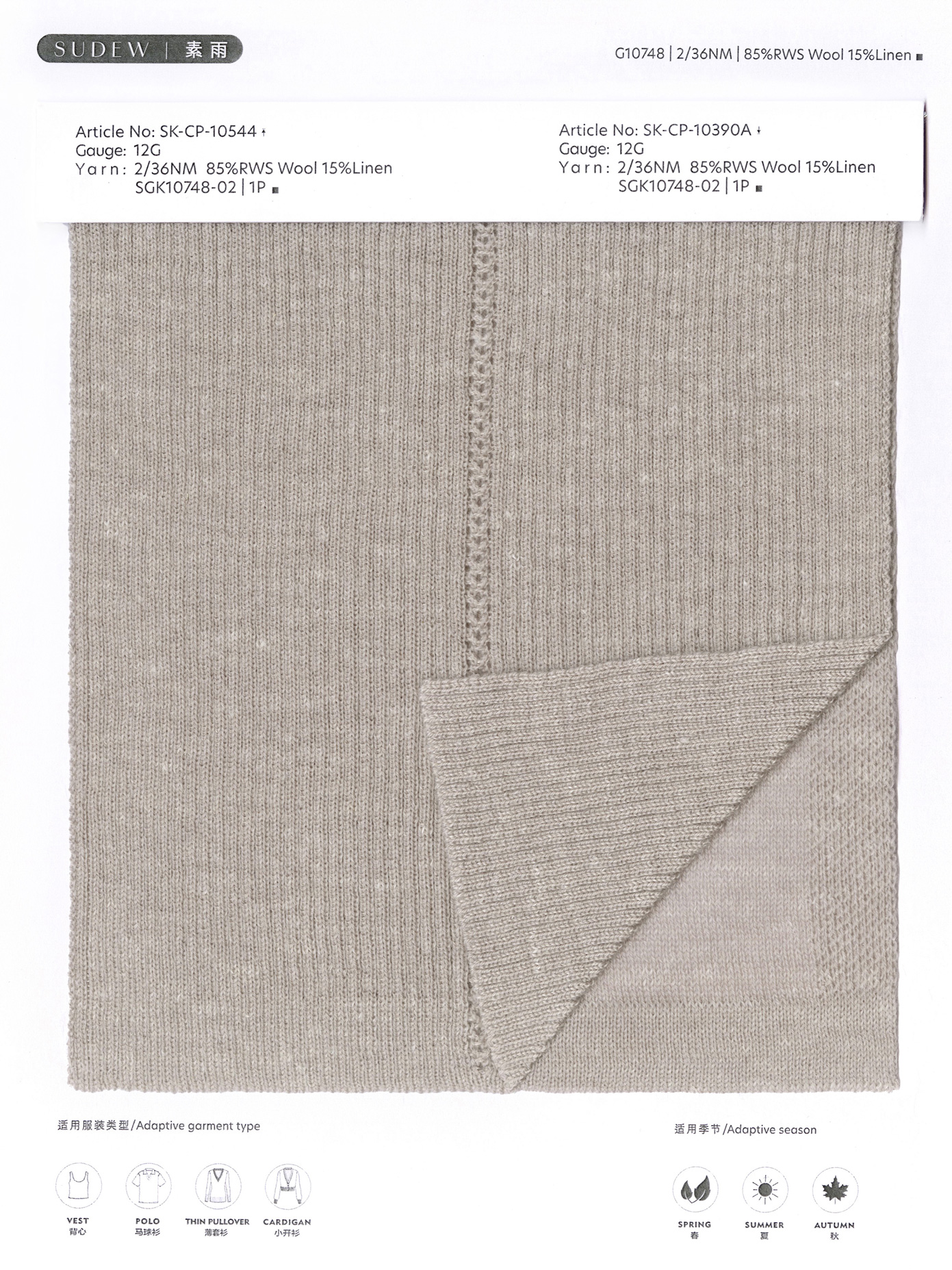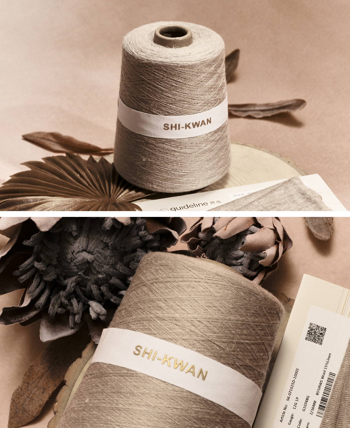此系列纱线我们选用了澳大利亚美丽诺羊毛与法国优质雨露麻纤维混纺,在精纺工艺中控制两种纤维的分布,羊毛提供保温层,亚麻形成吸湿通道,该款纱线的独特之处在于双纤维、双色彩、双功能的“和而不同、默契共生、彼此成就”,既保留了羊毛的柔软温暖与亚麻的骨感,又通过不刻意的混色呈现出布面的竹节肌理与层次,形成若隐若现的天然竹节效果。织物饱满细腻,回弹性佳,兼具羊毛的弹性和卷曲保暖与亚麻的天然吸湿、速干和天然抑菌,布面风格经典怀旧,呈现老钱风特有的低调张力与松弛有度的质感格调,特别适合多季节应用。