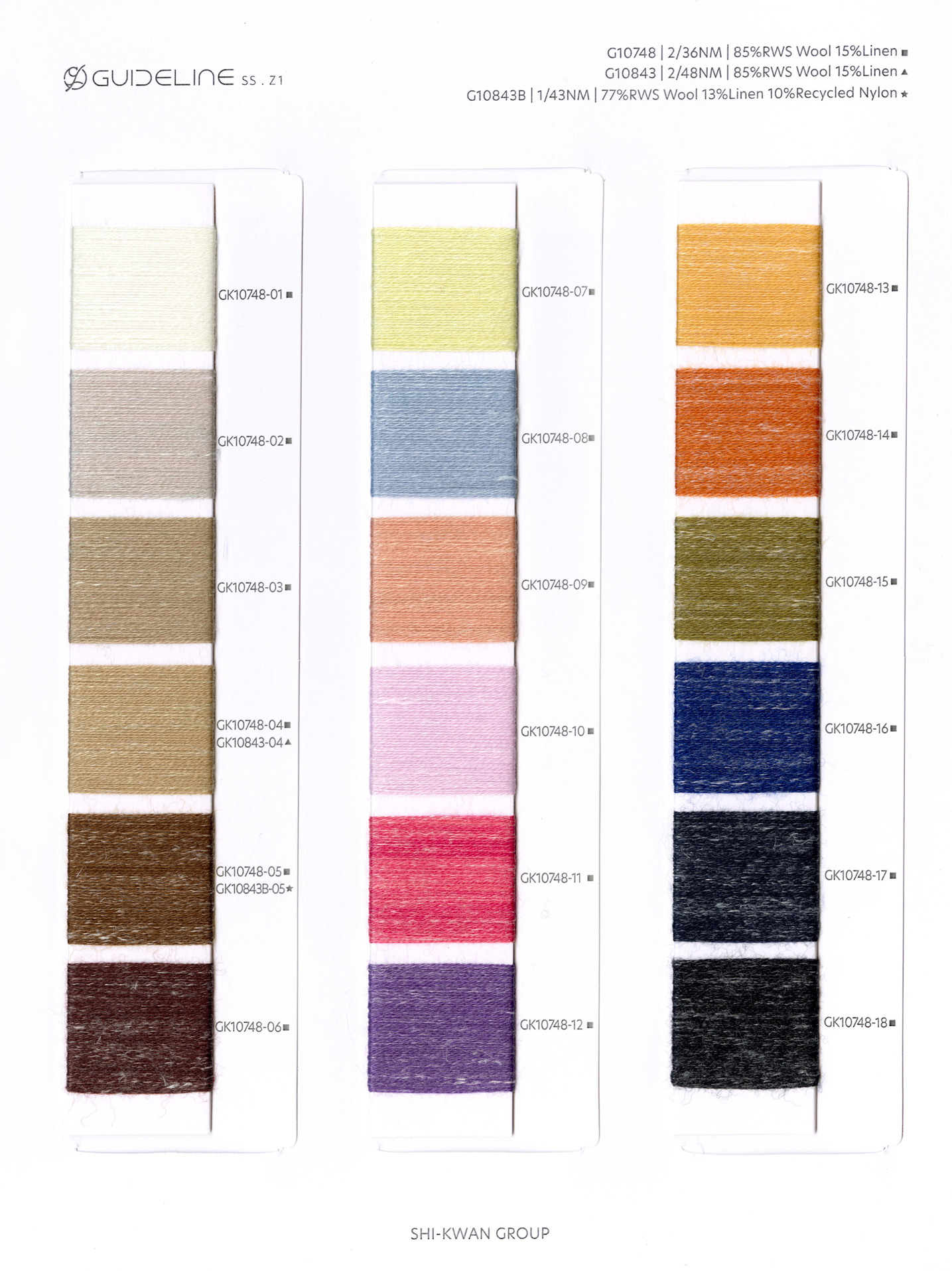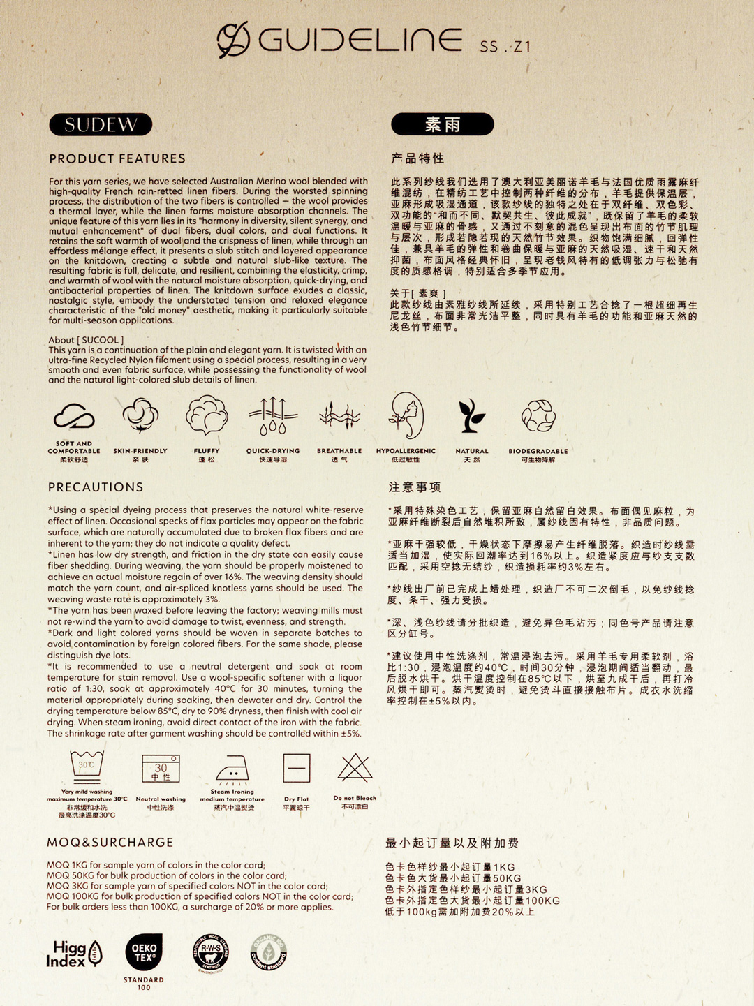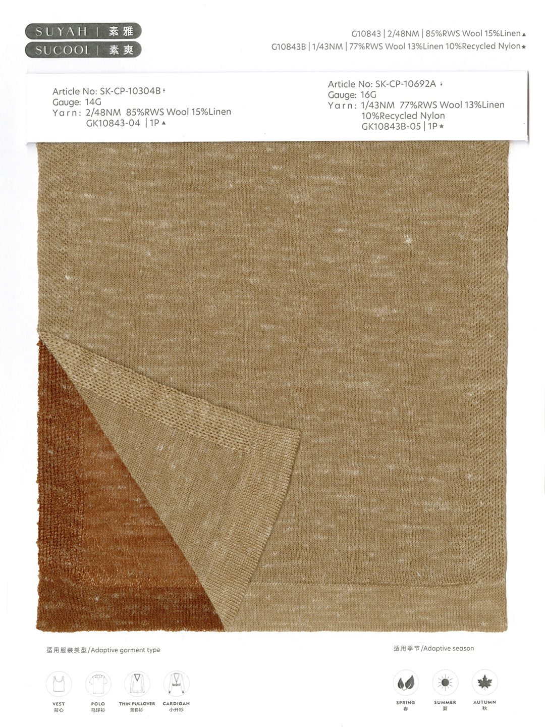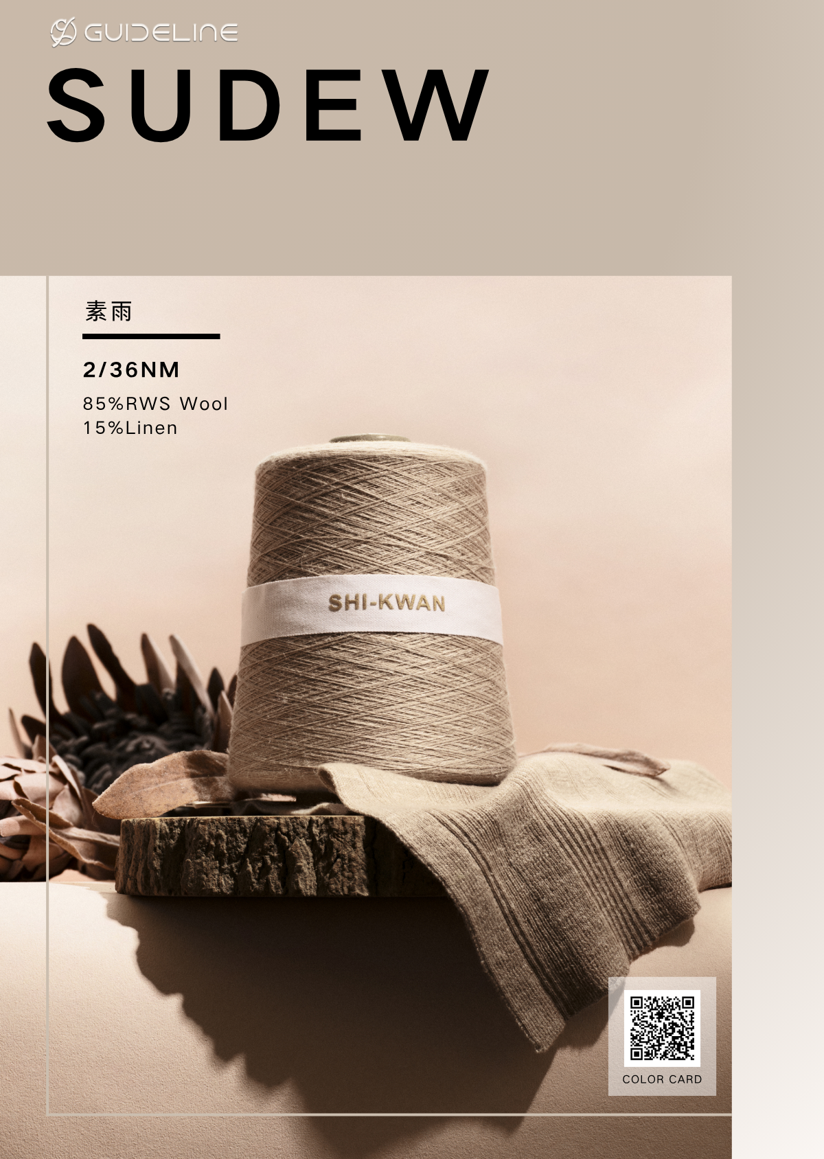 此款纱线由素雅纱线所延续,采用特别工艺合捻了一根超细再生尼龙丝,布面非常光洁平整,同时具有羊毛的功能和亚麻天然的浅色竹节细节。