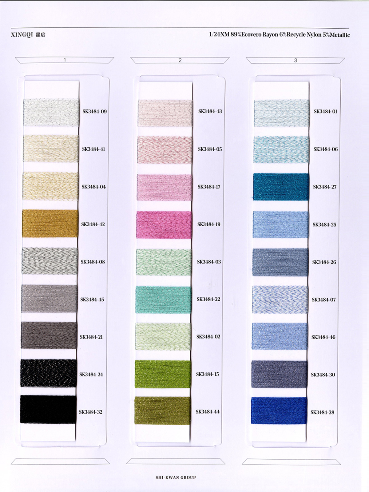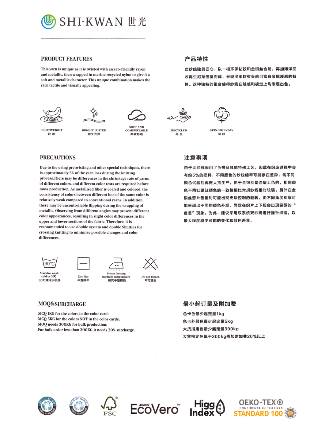 此纱线独具匠心,以一根环保粘胶和金银丝合捻,再加海洋回收再生尼龙包覆而成,呈现出柔软有骨感且富有金属质感的特性。这种独特的组合使得纱线在触感和视觉上均表现出色。